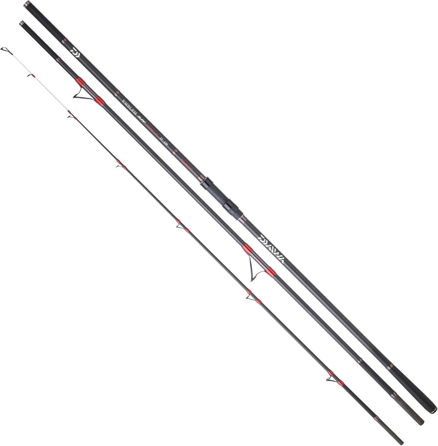 Daiwa Emblem Surf Type R 33, accion 100-225 gramos, peso 473 gramos. Una caña ligera y potente además de barata. Se pueden conseguir largas distancias con ella.